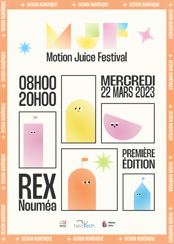 - This is a poster for the Motion show. Blurred 3D patterns on both the front and back help emphasize the distinct outline of the title in the center. Despite the use of multiple fonts, they all share similar styles, creating an appealing yet cohesive look.