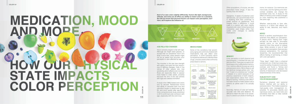- This magazine explores the influence of our state on color perception. For the cover, a top-angle camera shot is employed to feature the fruit, which conceals a letter related to a featured topic. The photos are vividly presented, while the title remains attention-grabbing due to the color contrast between the background and the title itself. Furthermore, both the photos and the title are thematically linked. The typography is not only easy to read but also captivating.